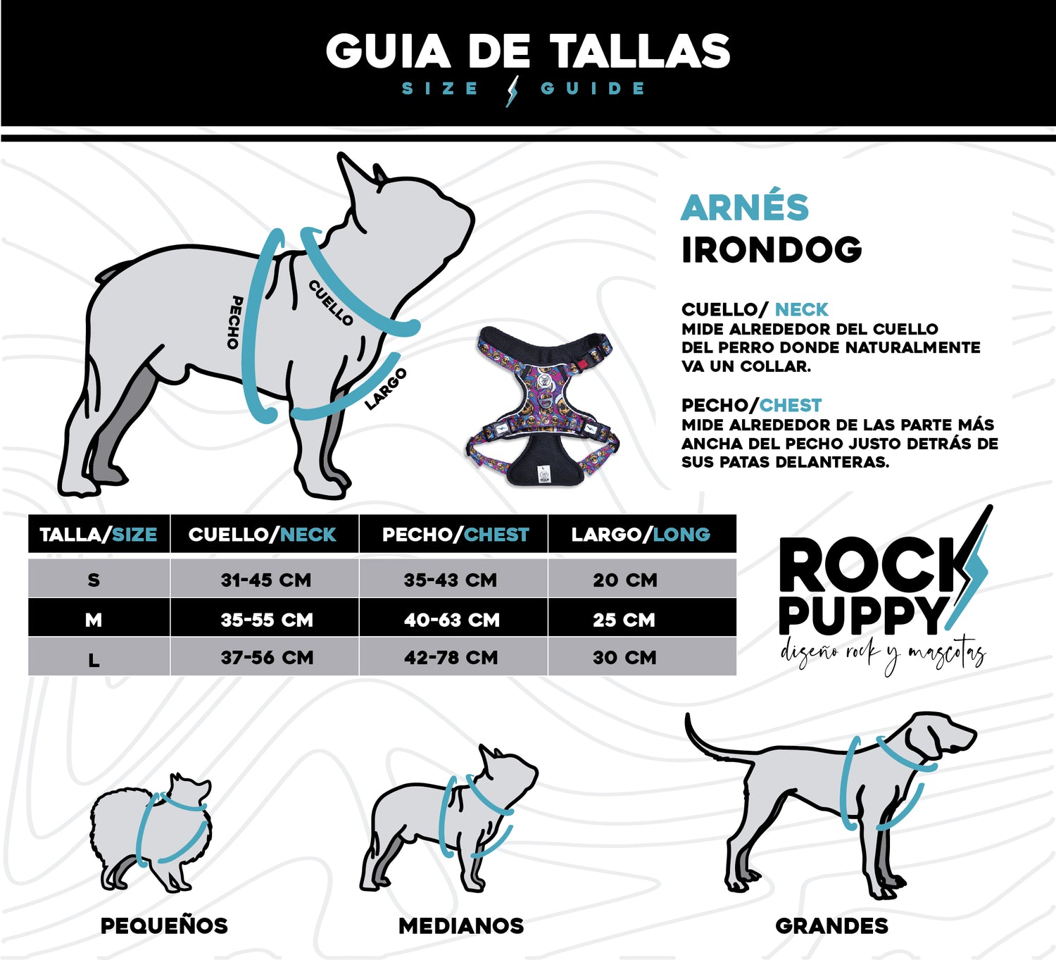 Nuestros arnés Irondog son totalmente ajustables, asegurate de medir bien a tu mejor amigo como lo especifica la imagen, todos los arnes tienen bloqueo de seguridad en el broche del cuello.